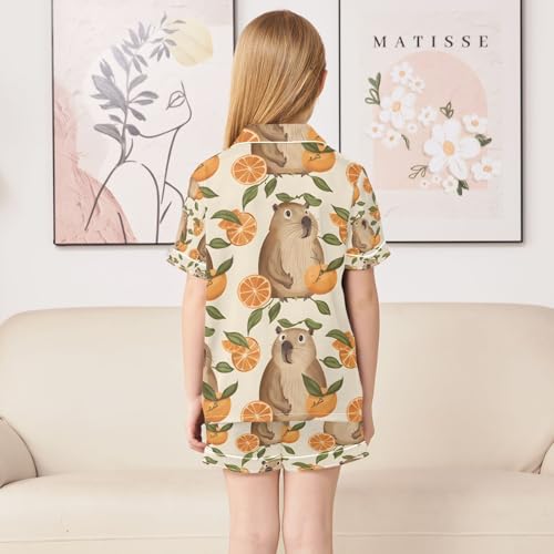 HOT ! senya Cute Capybaras with Oranges Satin Summer Pajama Sets Silk Short Sleeve Button Down Sleepwear