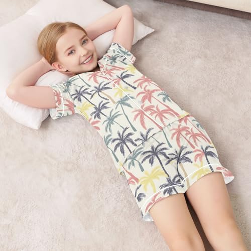 HOT ! Palm Trees Colorful Prints Summer Satin Pajama Set, Cute Button-Down Sleepwear Pj Set for Sleep Wears