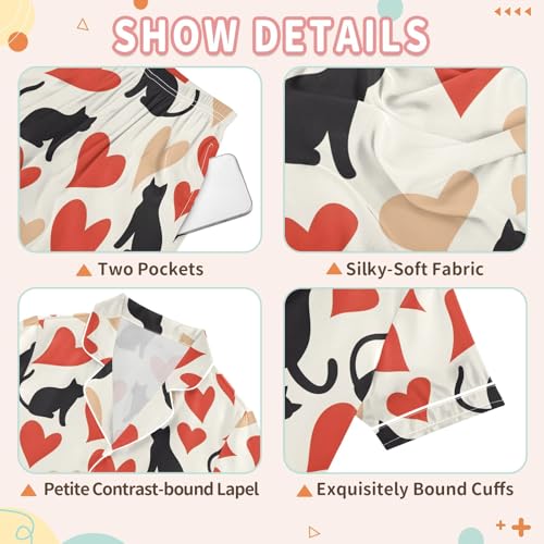 Black Cats Red Hearts Summer Satin Pajama Set, Cute Button-Down Sleepwear Pj Set for Sleep Wears 4