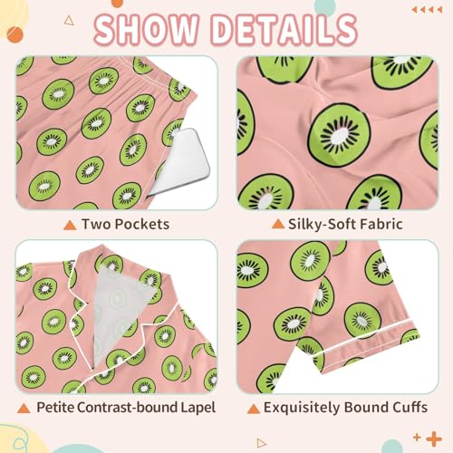 Simple Cartoon Kiwi Prints Summer Satin Pajama Set, Cute Button-Down Sleepwear Pj Set for Sleep Wears 4