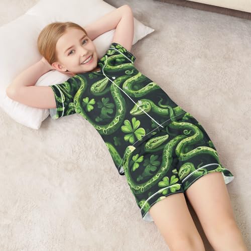 Satin Pajama Sets Short Sleeve Green Snakes Pattern Button Down Silky Nightwear 2 Piece PJS 5-14Y 1