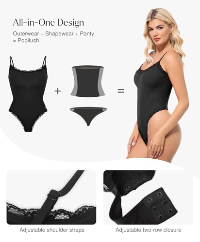 HOT ! Popilush Lace Body Suits Women - Square Neck Sleeveless Thong Bodysuit Tummy Conotrol Double Lined Camisole Tank Tops