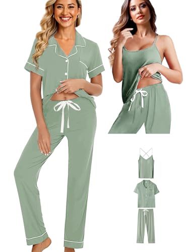 • Soft Knitted Material: The 3pcs short sleeves top long pants pajamas lounge set with camisole top use high quality super soft, smooth and stretchy knitted soft jersey fabric, Which is ultra skin-friendly, breathable and lightweight, so you can enjoy all night comfort—even in the summer. Appropriate thickness of the fabric always keeps you cool and comfy all through the night everyday.