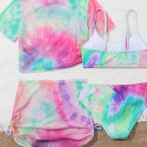 Girls 4 Piece Tie-Dye Tankini Sets Swimwear Bikini & Sun 𝐏rotection Cover Up Crop Top & Ruffle Skirt Swimsuit 3