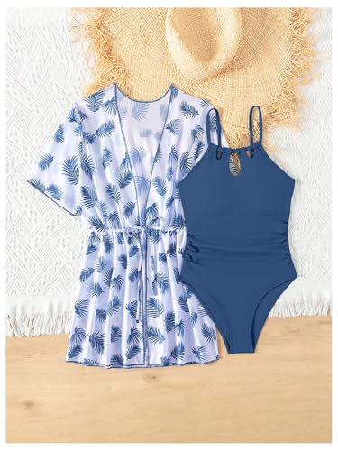 • Features: one piece bathing suit with cover up, short sleeve tie front kimono with tropical print, ruched detailing, spaghetti straps, summer swim set for girls