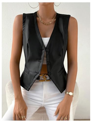 HOT ! MakeMeChic Women's Vest Tops PU Leather Button Down V Neck Sleeveless Cropped Vest Blazer Waistcoat