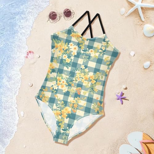 Flowers Dark Blue Gingham Girl Toddler Swimsuit Bathing Suits Swim Suit for Girls Beach Swimwear 3T 6