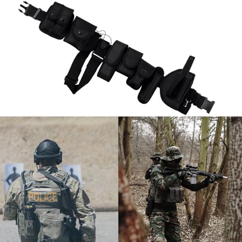 • 10 in 1 Security Tactical Belt: Adjustable multifunctional tactical belt built-in 9 different multifunctional component pouches bags, including rope bag, walkie-talkie bag, keychain, flashlight bag, water spray bag, dual clip bag, T-shaped stick strap, camera bag, pis-tol bag. All components can be easily removable from the police utility belt.