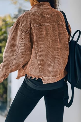 Womens Cropped Corduroy Jacket Casual Button Down Shacket Coat Fringe with Frayed Hem 5