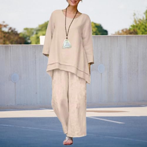 HOT ! Women Linen Two Piece Pantsuits 2024 Casual Crewneck Long Sleeve Shirt Tops Wide Leg Lounge Pants Fashion Outfits