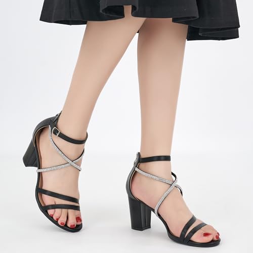 Ecetana Heels for Women Open Toe Ankle Strap Buckle Rhinestone Sandals Block Chunky Sexy Shoes for Party Wedding 1